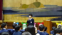 運営・環境委員会児童による「はじめの言葉」で、「成果をしっかりと発表しましょう。」とみんなに呼び掛けました。